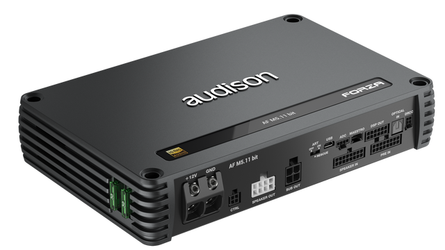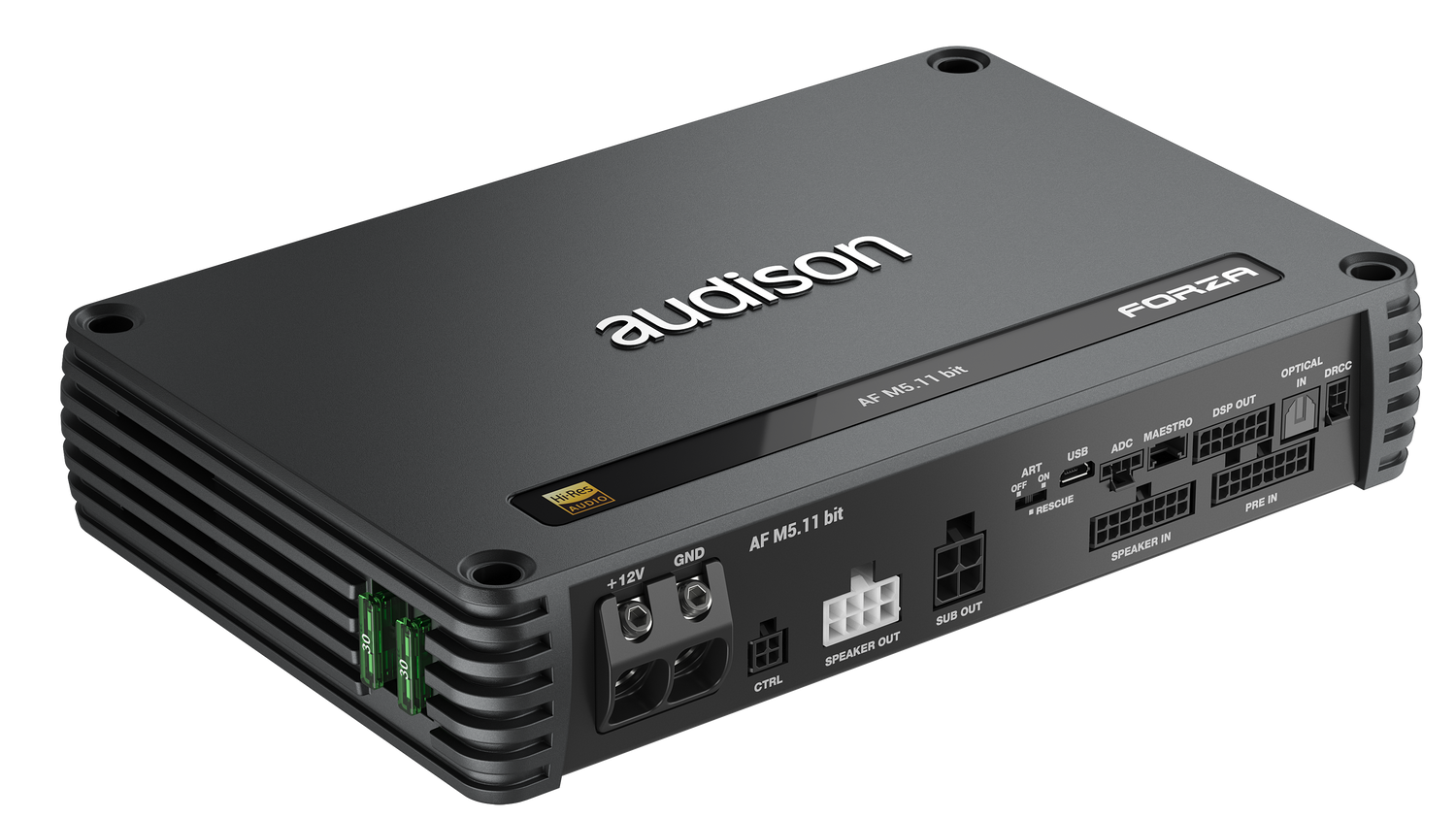 Forza AF M5.11 bit, un amplificateur DSP 5 canaux puissant d'Audison. Cet appareil se distingue par son son audiophile, qui est atteint grâce à la dernière génération de la technologie D-Class. L'AF M5.11 bit est remarquablement compact, mais dispose néanmoins de suffisamment de puissance pour vraiment animer une session d'écoute. Ses fréquences de commutation plus élevées, son filtrage plus abrupt et ses composants à plus haute tolérance offrent un son exceptionnel qui dépasse les attentes en matière de Class D. Le tout est complété par un DSP natif qui fonctionne à 24 bits/96 kHz, s'étendant jusqu'à 40 kHz et ayant ainsi obtenu le précieux certificat de haute résolution. Le Forza AF M5.11 bit offre la possibilité de fournir une performance flexible et puissante et prend en charge la fonction Absolute Volume d'Audison, qui est exceptionnelle.