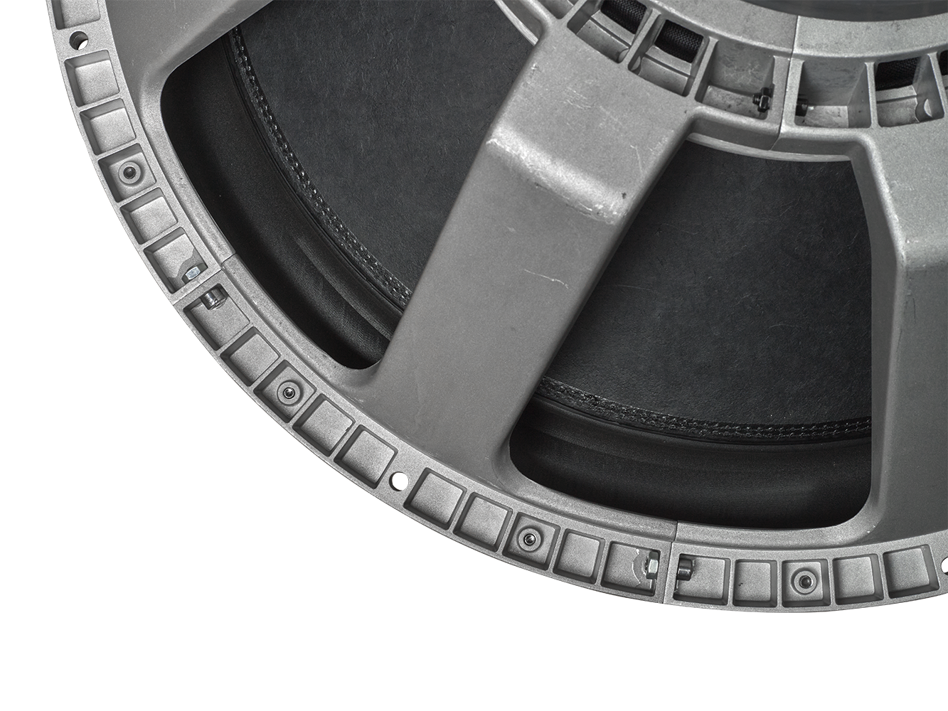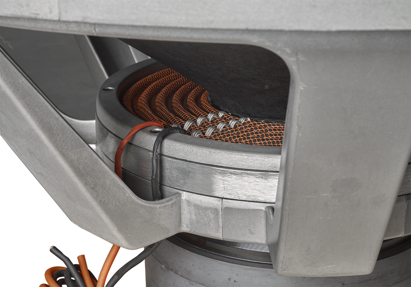 À ce niveau ultime, la linéarité et la précision sont essentielles. Un ensemble mobile avec un énorme cône et une bobine de 6 pouces est destiné à être lourd (plus de 1860 grammes), ce qui doit rester parfaitement aligné même lors d'excursions extrêmes. Pour garder cette énorme masse mobile sous contrôle, nous avons mis en place un pack araignée Nomex à 4 couches avec une maille orange à côté d'un entourage en mousse méga-rouleau au sommet - bien sûr doublement cousu au cône.