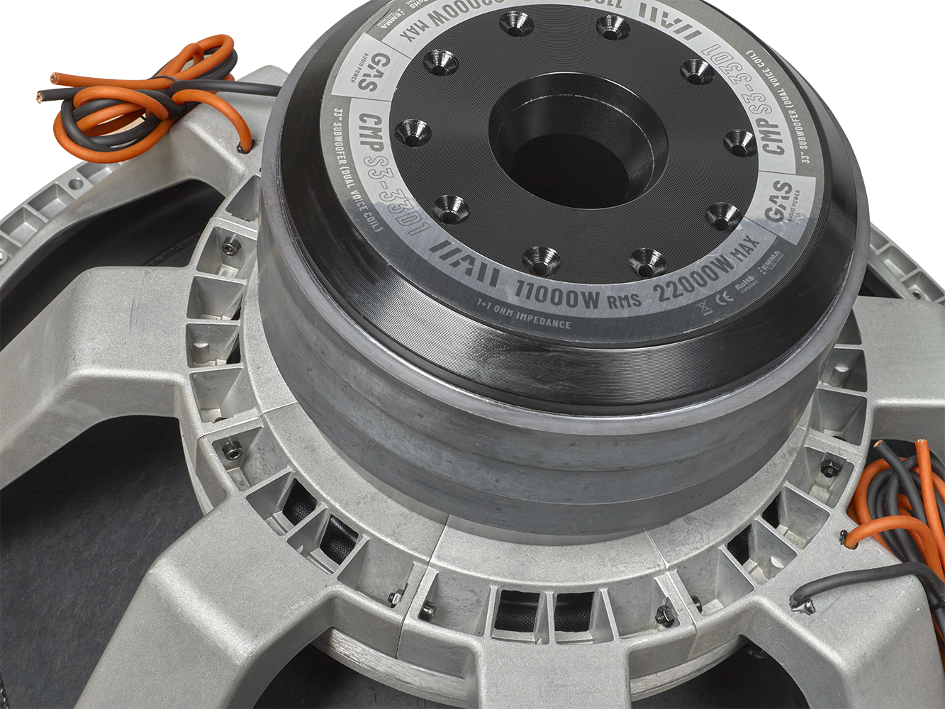 Une bobine acoustique à fil plat en aluminium anodisé noir de 6 pouces et 8 couches confère au CMP S3-33D1 de formidables capacités de gestion de la puissance et de dissipation de la chaleur. Pour obtenir le meilleur transfert de signal possible et une durabilité accrue, des fils de guirlande à double revêtement argenté ont été cousus dans le pack d'araignées. Les fils directs en cuivre sans oxygène pré-raccordés de 10 mm² offrent une excellente conductivité pour assurer une connexion directe solide et fiable entre la bobine du caisson de basses et votre amplificateur, sans points de résistance supplémentaire ou de mauvais contact.