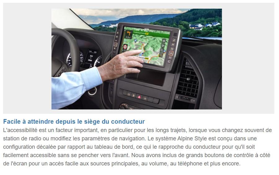Alpine présente le système de navigation de style alpin de troisième génération pour Mercedes Vito (447). Le X903D-V447 est doté d’un grand écran tactile de 9 pouces, installé à distance du tableau de bord pour être parfaitement accessible depuis le siège du conducteur. Cela facilite la visualisation et le contrôle des cartes de navigation et d’autres fonctions.