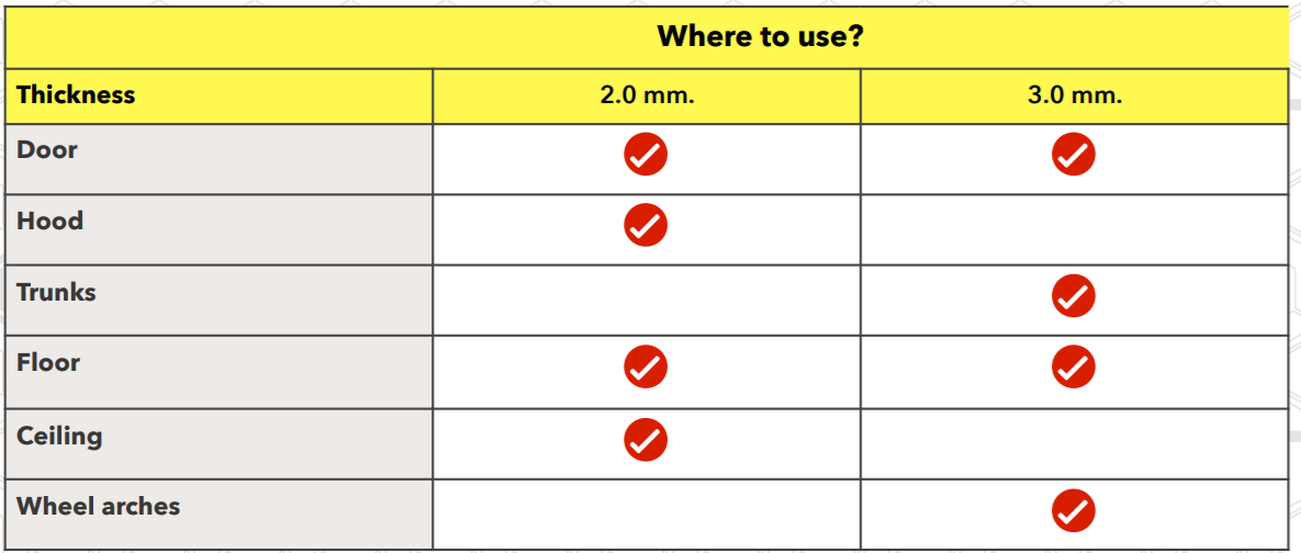 Série de matériaux alliant haute qualité à un prix raisonnable. Trois types d'épaisseur permettent de choisir un matériau d'amortissement vibratoire en fonction du composant de carrosserie traité. Les importantes propriétés d'absorption des vibrations dépendent de la formule améliorée de la couche de mastic, ainsi que de la feuille d'aluminium gaufrée de 100 microns d'épaisseur, ce qui réduit les bruits de structure.