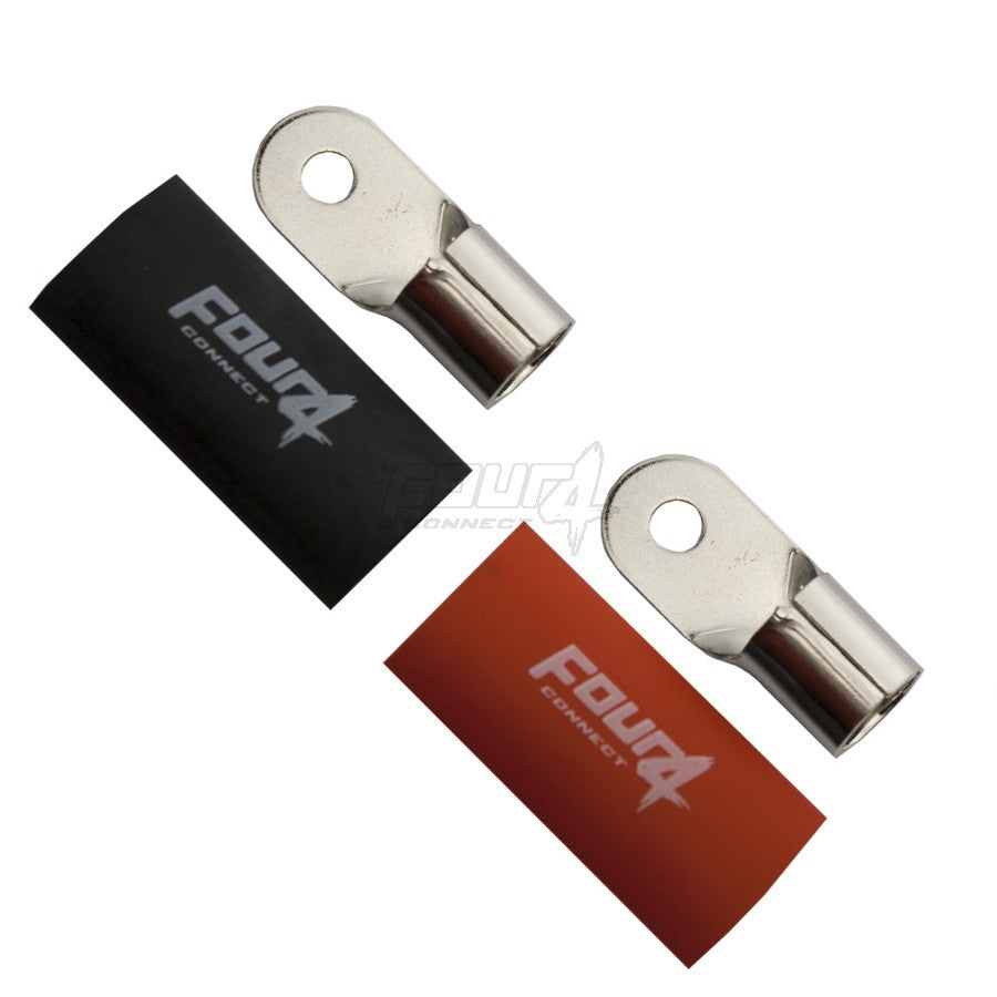 Lot de 2 bornes à anneau rhodiées pour câbles 50 mm². 100 % cuivre, fixation M6, avec tubes thermo rétractables inclus. Idéal pour audio voiture et connexions batterie haute puissance.