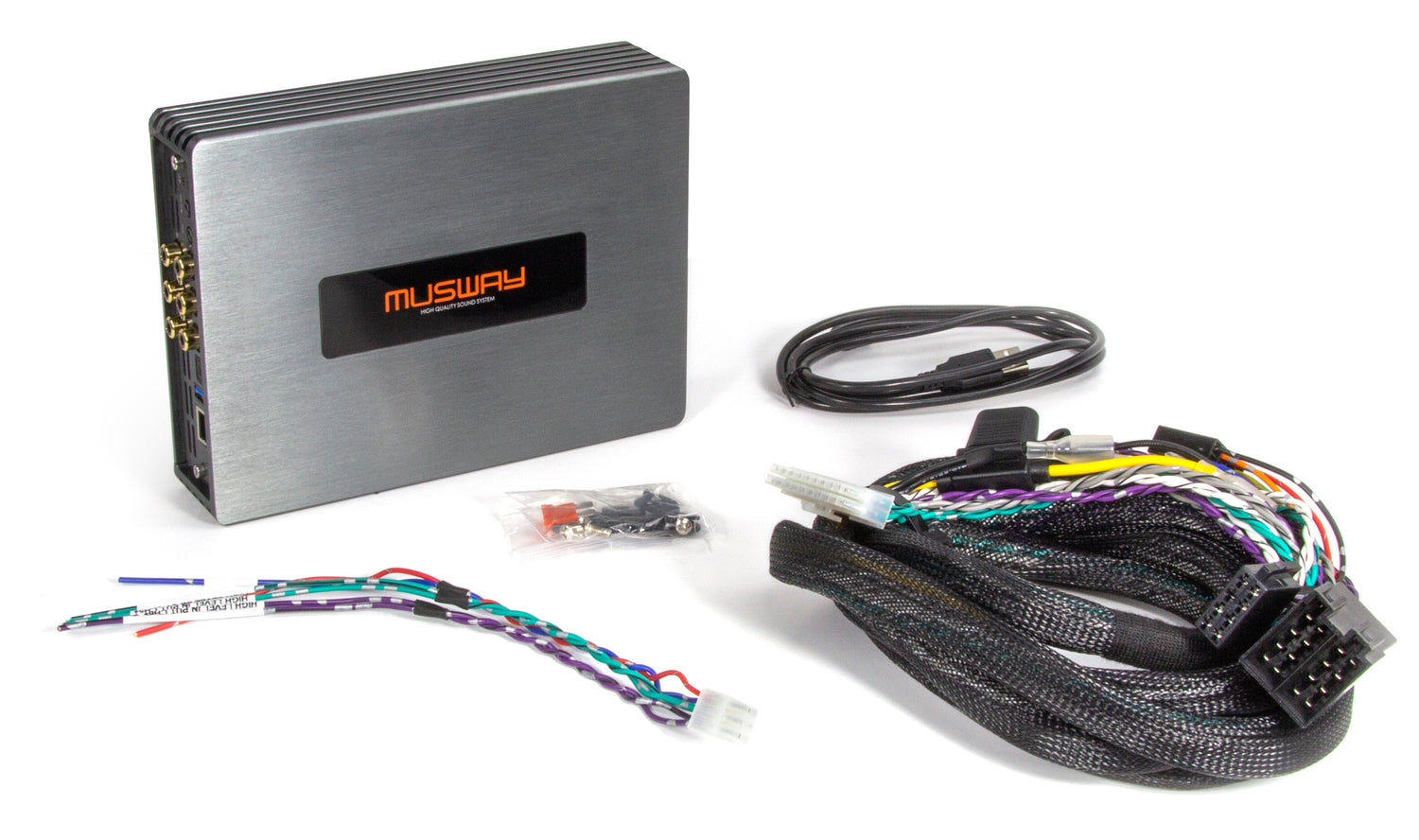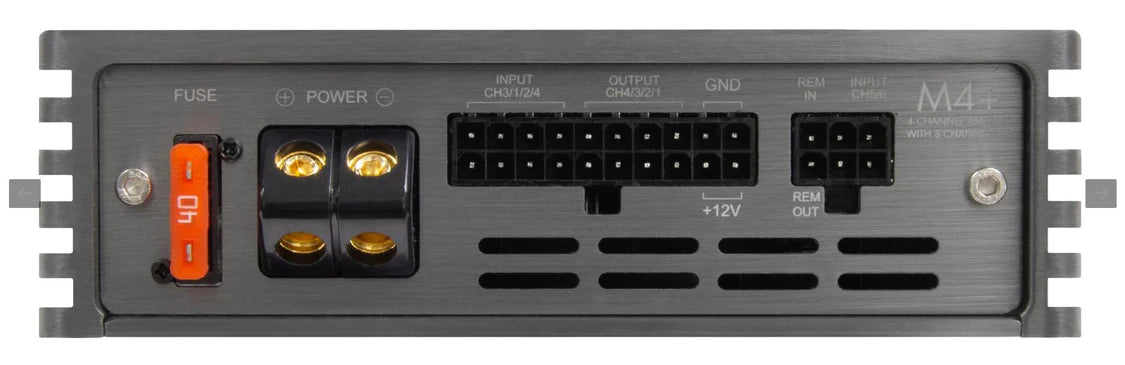With the included wiring harness including an ISO connector and the optionally available Plug+Play cable sets , the M4+ is perfect for tuning 4-channel factory audio systems, allowing the integration of additional amplifiers with the four additional preamplifier outputs adjustable via DSP. Finally, the M4+v3 amp also features a high-level input with error protection system for interference-free connection to OEM factory radios.
