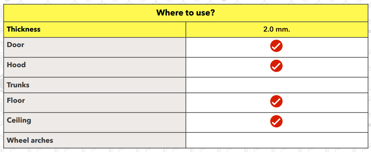 This is a basic vibration damping material that combines effective vibration absorption properties with a reasonable price. A 60 micron thick sheet provides the flexibility of the material - which is necessary when dealing with irregular shapes. The universal thickness of the material (2 mm) allows for the treatment of all essential body components - doors, luggage compartment, roof, floor and bonnet.