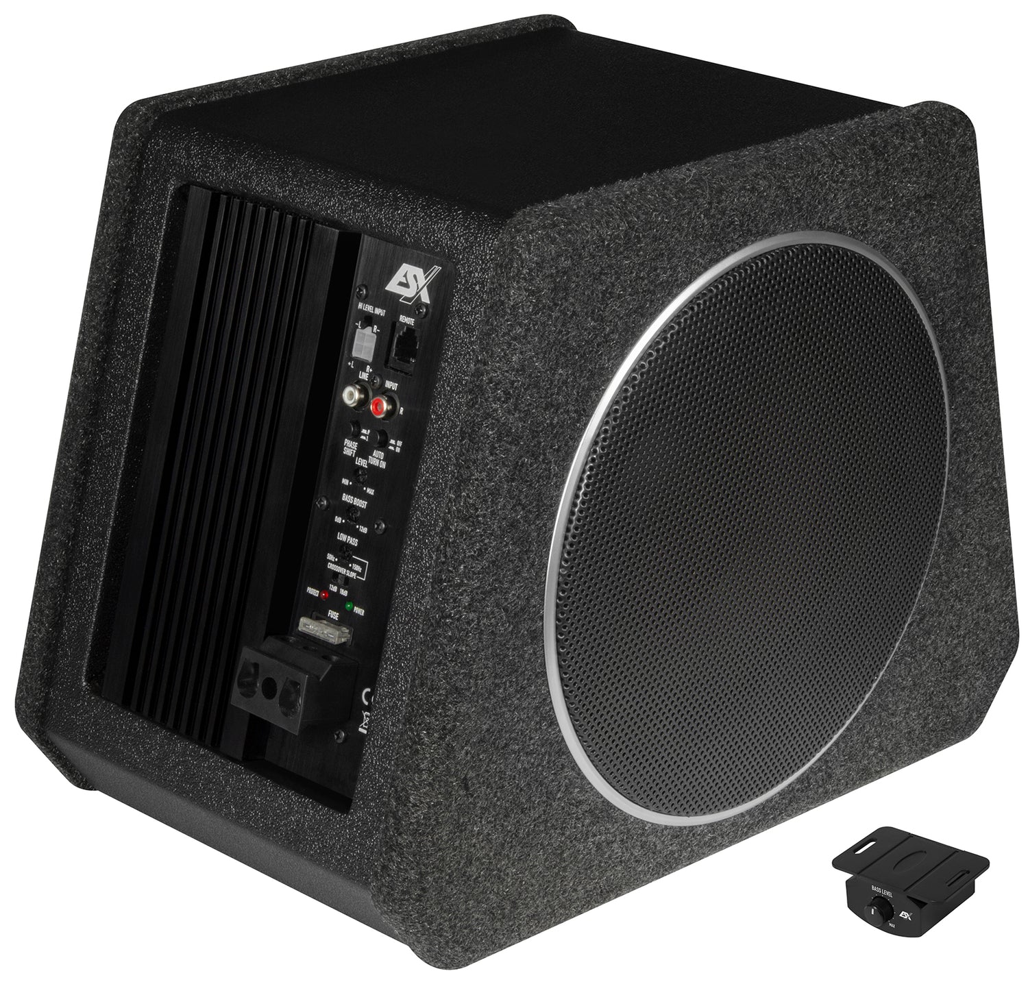 The VISION V800A trapezoidal system with 20 cm (8”) woofer and opposed passive radiator for more bass pressure is perfect for small trunks or the niche behind the seats. The system is equipped with high-level inputs and an automatic switch-on function and, with its powerful digital amplifier module, provides the missing bass power in existing sound systems or in factory systems. A compact cable remote control is included as standard to control the bass level from the driver's seat.