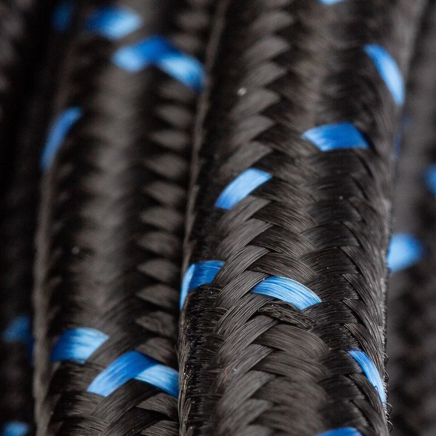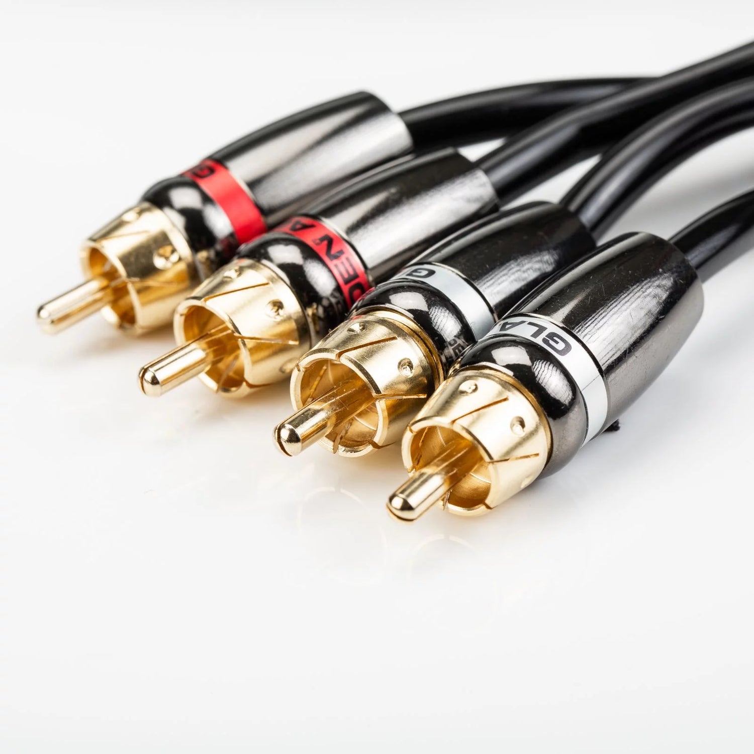 Low-interference, highly flexible RCA cable with metal RCA connectors and gold-plated contact surfaces. Shielding is provided on one side of each cable. This allows induced interference to be transmitted to ground. A textile sheath around the cable protects it from mechanical stress.