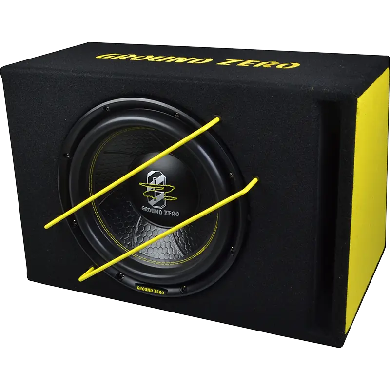 Passive vented enclosure featuring a 12-inch IRIDIUM SPL subwoofer with EFP front bass channel and angled rear wall