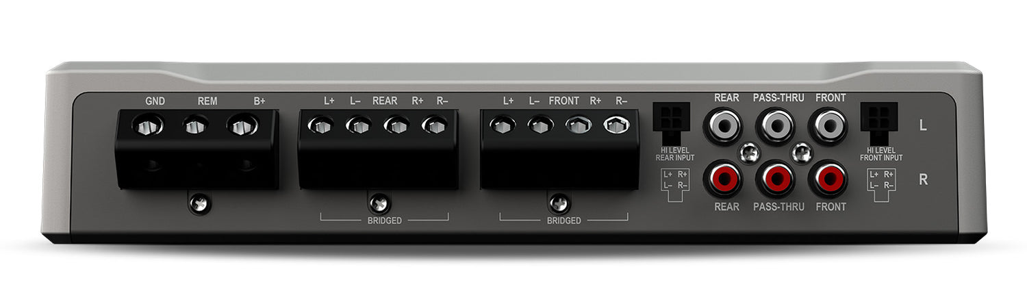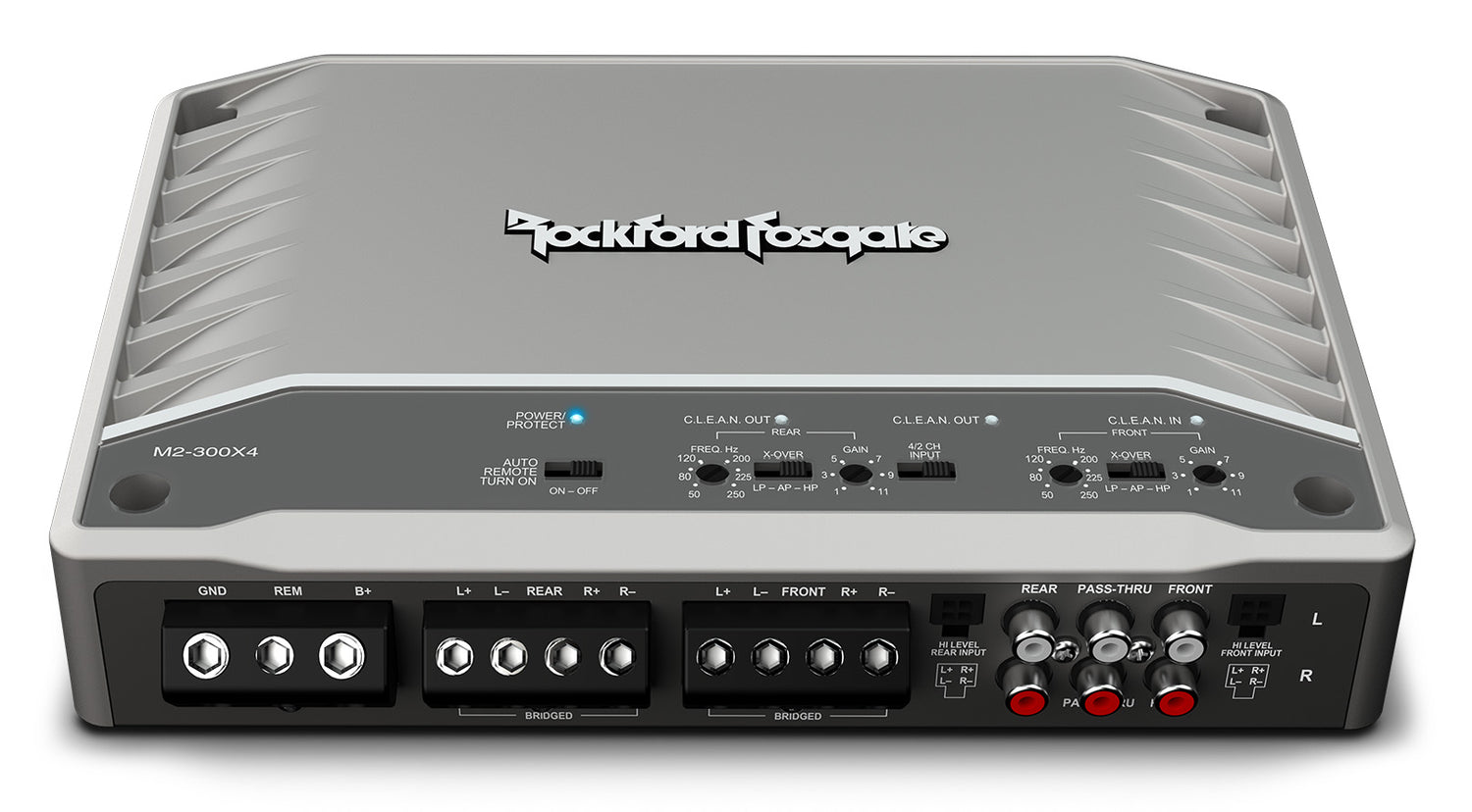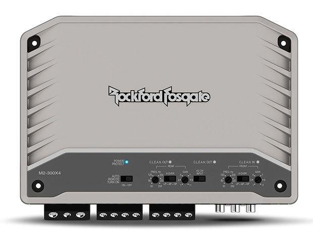 Conçu pour résister aux intempéries, l'amplificateur Element Ready™ M2-300X4 de 300 watts est un modèle large bande de classe D, capable de fonctionner sous 4 Ω ou 2 Ω en stéréo, et sous 4 Ω en mono/bridgé. Cet amplificateur est extrêmement efficace grâce à sa technologie de classe D qui réduit la sollicitation du système électrique. Il est également doté d'un circuit CLEAN pour faciliter le réglage du gain et d'une alimentation qui génère plus de puissance lorsque la tension augmente.