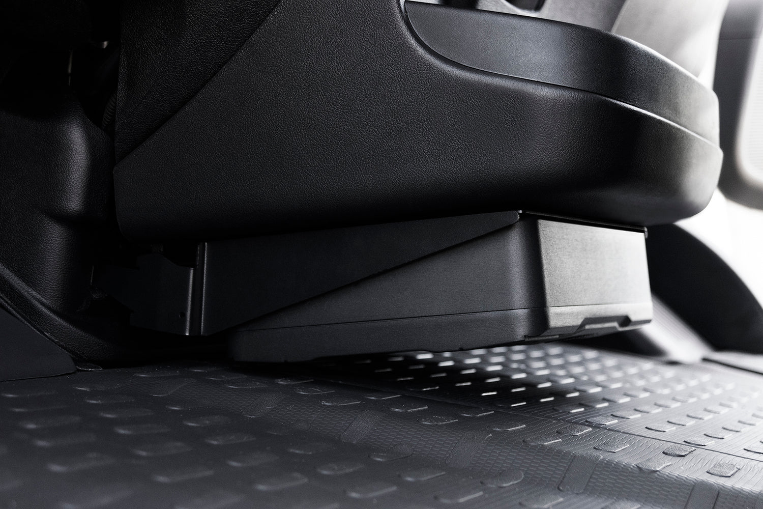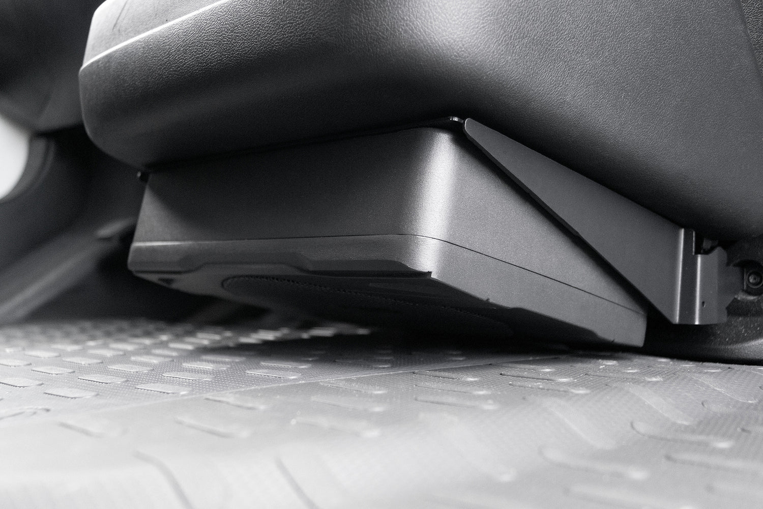 Tous ceux qui hésitaient auparavant à sacrifier un espace de stockage précieux pour des basses supplémentaires seront ravis par la solution d'installation ingénieuse de l'ESX Sub : il se fixe directement sous la console centrale, sous les porte-gobelets. Cependant, afin d'éviter les vibrations gênantes et le balancement du support de canette, les développeurs d'ESX ont mis au point une solution de montage astucieuse : le caisson de basses lui-même est fixé aux barres métalliques du véhicule derrière la console à l'aide d'un cadre en acier spécial. Lorsqu'il est monté ainsi, le QXF201A « flotte » essentiellement dans les airs, ce qui signifie que les vibrations gênantes ne peuvent pas être transmises à la console ou au tableau de bord.