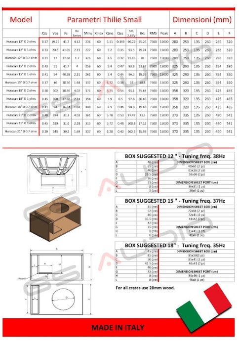 Toutes les versions 12" / 30 cm , 15" / 38 cm , 18" / 46 cm et 21" / 54 cm sont dotées d'un cône en fibre de carbone et Kevlar fabriqué à la main en Italie pour une rigidité et une résistance maximales. Un tissu Kevlar spécial est appliqué à l'arrière pour éviter les courts-circuits avec le filament lors des excursions les plus intenses.