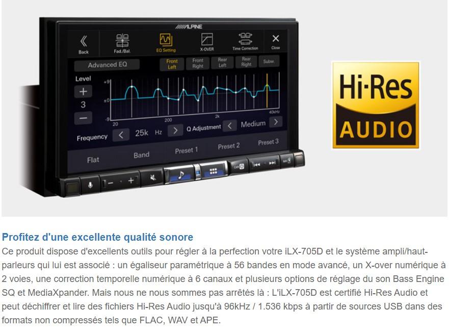 Offrez une qualité de son incomparable à votre véhicule grâce à l'Alpine iLX-705D. Cette station multimédia est l’une des premières au monde à être dotée d'un amplificateur de classe D intégré et d’un large éventail de fonctions avancées au niveau du réglage du son, telles que des X-overs numériques, un égaliseur paramétrique, une correction numérique de l’alignement et bien plus encore.