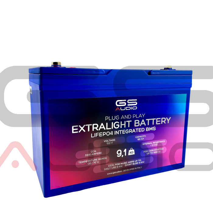 Batterie ultralégère 100Ah LifePo4 13,2V 9,1kg - Gs Audio - CCA:3800A vis M8