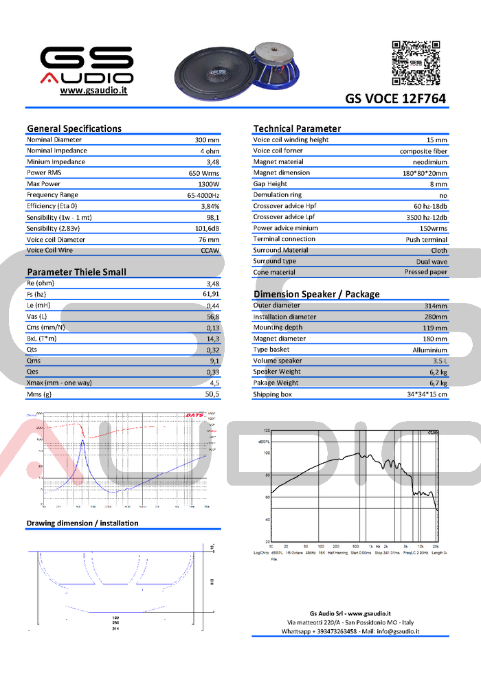 Les paramètres Thiele et Small parlent d'eux-mêmes. L'amortissement mécanique élevé du haut-parleur (Qms) garantit une excellente sensation de clarté dans le grave, de vitesse et de propreté qui se matérialise dans un grave net et précis.