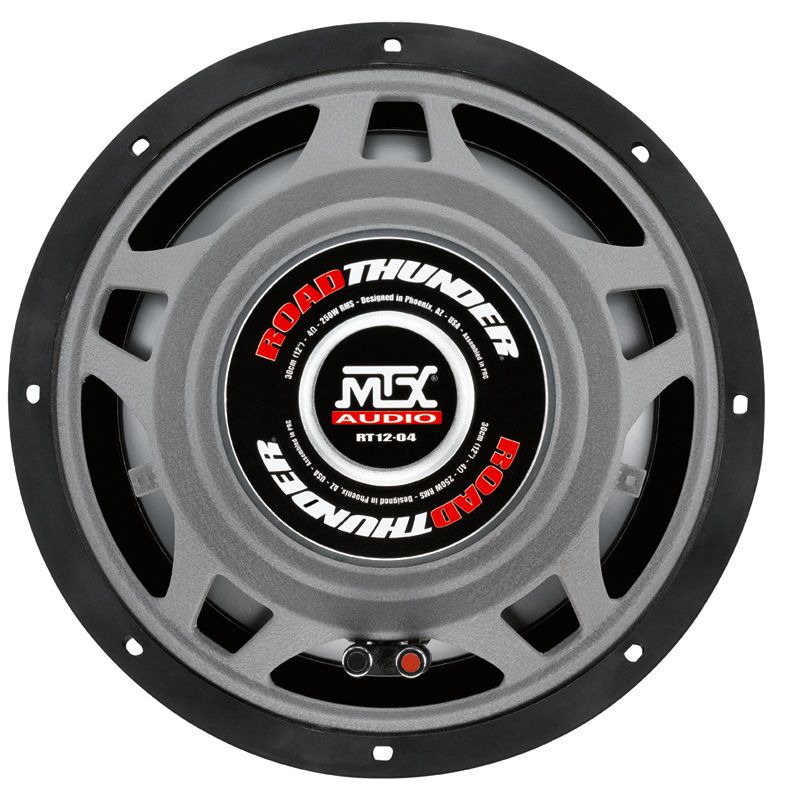 Le subwoofer 30cm MTX RT12-04 (250W RMS) ne manque pas d’atouts : suspension caoutchouc à large débattement, membrane polypropylène avec logo MTX en relief, grosse structure magnétique, grosse bobine de 50mm, technologie PSV pour le refroidissement, technologie ALDS… Vu le tarif, c’est un exploit.